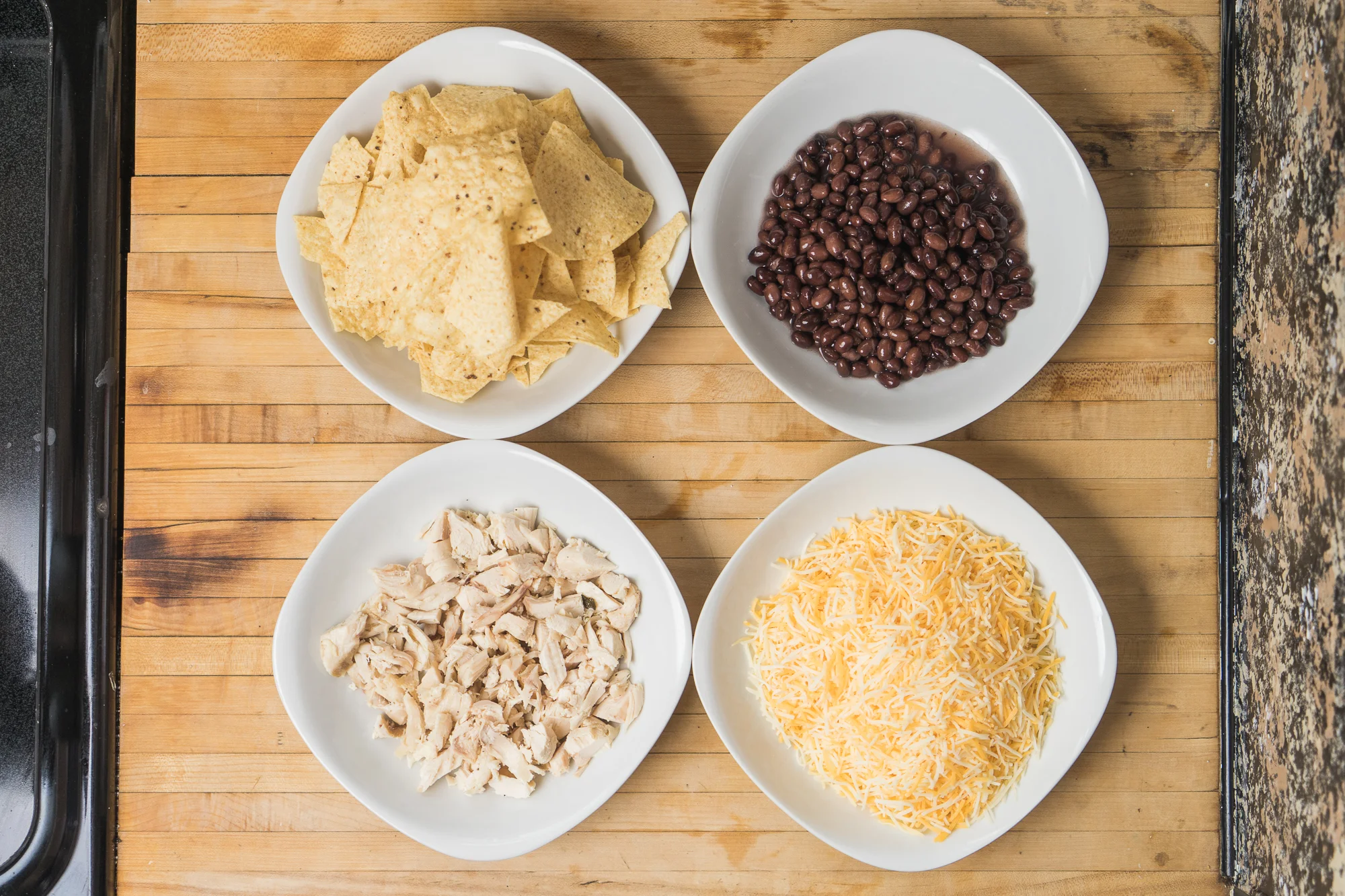 On a recent night like this, I foraged and came up with cooked chicken, chips, cheese and canned black beans and this “recipe” was born!
