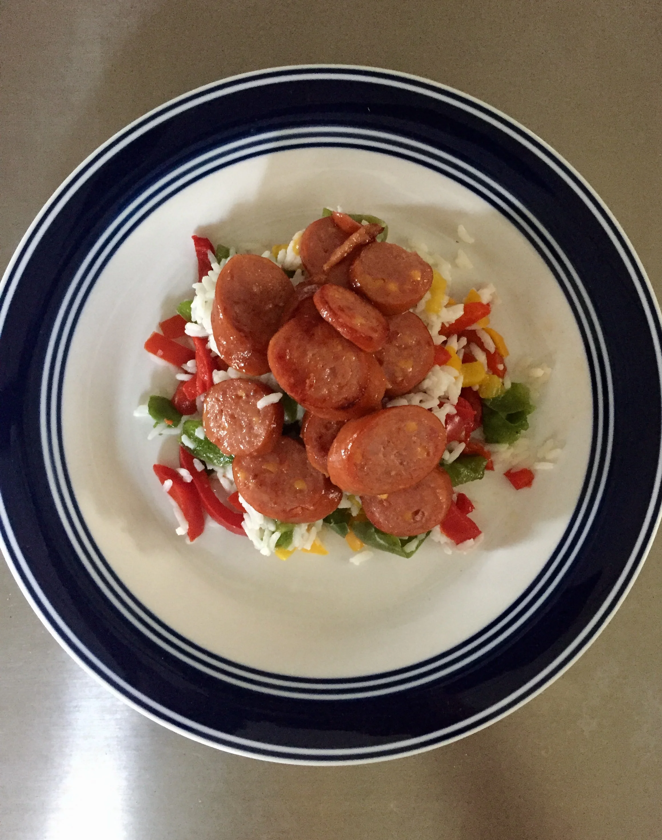 - Serve rice and bell pepper mixed topped with cooked sausage and ta-dah! Dinner in a hurry!
